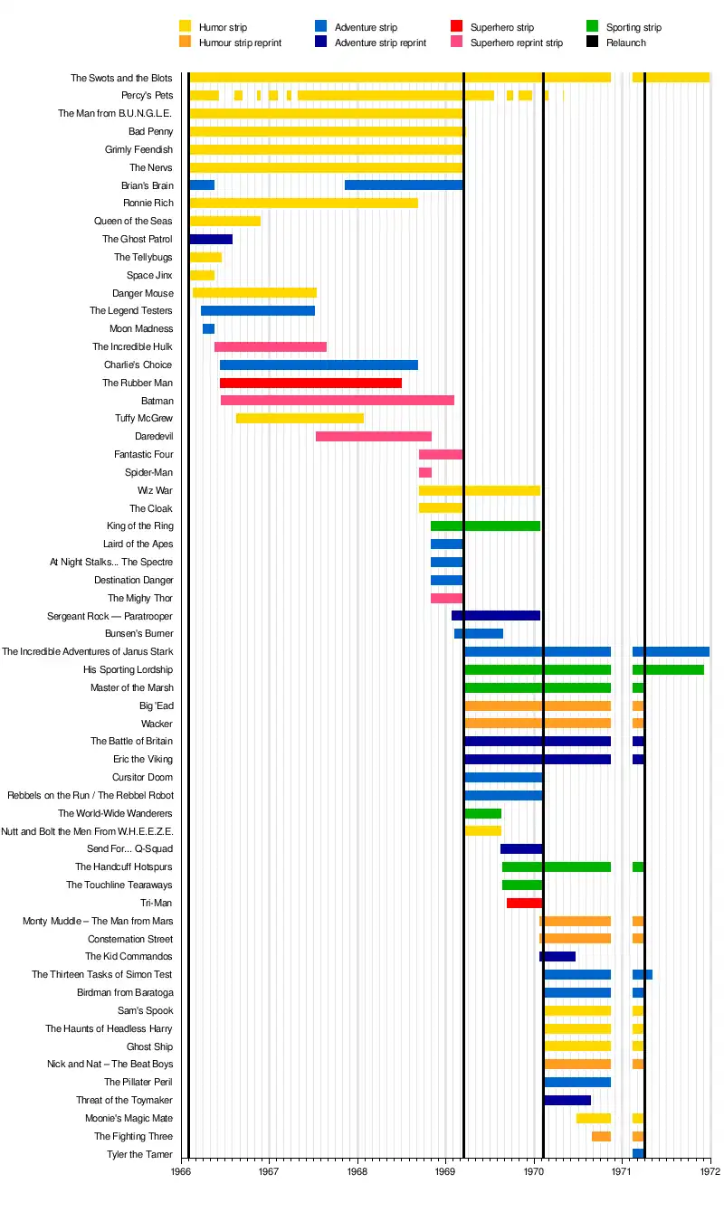 | Main character(s) | The Swots and the Blots Bad Penny Grimly Feendish Janus Stark His Sporting Lordship Hulk (reprints) Batman (reprints) |