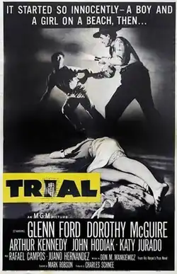 Trial is a 1955 American drama film directed by Mark Robson and starring Glenn Ford, Dorothy McGuire, Arthur Kennedy, John Hodiak, Katy Jurado, Rafael Campos, and Juano Hernandez. Adapted by Don Mankiewicz from his own novel of the same name, the story concerns the trial of a Mexican boy accused of rape and murder who is initially victimized by prejudiced accusers, and then becomes a pawn of his communist defender, whose propagandist purposes would be best served by a guilty verdict.