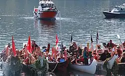 Many families and teams travel in canoes featuring art and names reflective of their place of origin, and they wear traditional regalia for celebrations which feature the sharing of songs, dances and gifting. Some canoes are made of cedar; others are made using more modern techniques and materials. Canoe families visit Native Nations en route to the final host destination, which changes each year.[1]