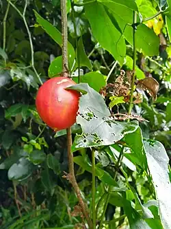 Trichosanthes pentaphylla, commonly known as red gourd, is a species of plants in the family Cucurbitaceae found only in coastal northeast Queensland, Australia. It is a tendril climber up to 15 m (49 ft) long and 4 cm (1.6 in) stem diameter. The leaves are palmately divided with 3–5 leaflets, carried on a petiole up to 7 cm (2.8 in) long. The species is dioecious, meaning that male and female flowers are borne on separate plants; both are white with fringed petals and about 4 cm (1.6 in) diameter. The fruit is bright red, ovoid, and about 7 cm (2.8 in) long by 5 cm (2.0 in) wide. The plant was first described in 1867 by English botanist George Bentham.[4][5][6]
