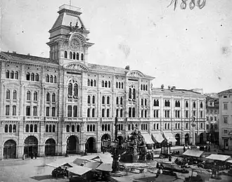 The building, designed by architect Giuseppe Bruni, was erected between 1873 and 1875, when Trieste was part of Austria-Hungary. Bruni's project had been chosen because it had the adavantage to stay within the planned budget and to easily fit the old building previously located there.[1] Construction works were supervisioned by Eugenio Geiringer.