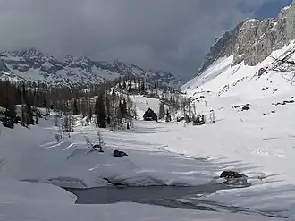 The Triglav Lakes Lodge (Slovene: Koča pri Triglavskih jezerih)[1] (1685 m) is a mountain lodge between Double Lake (Dvojno jezero) and the artificial Lake Močivec (jezero Močivec) below Mount Tičarica in the heart of the Julian Alps, northwestern Slovenia. The first structure was built in 1880 by an Austrian hiking club. In 1955 and 1988, it was rebuilt and expanded. It has four dining rooms with 150 seats, 13 rooms with 30 beds, and 13 larger sleeping rooms with 170 bunks. The lodge is open from the end of June until the start of October