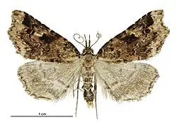 ♂♀. 24-28 m.m. Head and thorax pale whitish-ochreous, sprinkled with fuscous and dark fuscous. Forewings triangular, costa arched anteriorly, slightly sinuate in middle, termen oblique, waved, concave on upper half, obtusely angulated on vein 4; pale whitish-ochreous, irregularly sprinkled with fuscous or brownish-ochreous; a short blackish line from costa almost at base; first line irregularly dentate, blackish, more or less partially obsolete; a rhomboidal spot of blackish-fuscous suffusion in disc above middle, above which are two short blackish-fuscous marks from costa; space between this and second line forming an irregular suffused white spot; costal edge above this dark fuscous dotted with whitish; second line waved, whitish, interruptedly edged anteriorly with blackish, curved inwards on lower half; subterminal dentate, pale, edged with fuscous, space between second and subterminal lines on upper third filled with blackish -fuscous; a terminal series of undefined dark fuscous dots : cilia fuscous-whitish, mixed with fuscous. Hindwings grey-whitish sprinkled with grey; a faint pale curved postmedian line, darker-edged anteriorly.[2]