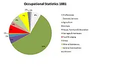 By 1811, the census shows that the population of the parish was 346, with 175 males and 171 females. In the village, 35 families were chiefly employed in agriculture, 17 in trade/manufacture and the remaining 19 families were unknown or not recorded.[6] There is more data on occupations in 1881. The breakdown for the males was 57 in agriculture, 7 in general commodities, 7 in domestic services/offices, 6 in food and lodging and 5 working with animals. In contrast, 26 females worked in domestic services and offices and the occupation of the remaining 76 was not stated.[7] The population of Trimley St Mary has continued to grow since records began in 1801, when the population was only 330.[8] By 2011, it had reached 3,665.[9] The 2011 census showed that employment in Trimley has altered greatly. The percentage working in agriculture has declined to less than 1% of the working population. The biggest increases have been seen in manufacturing, wholesale, retail, transport, storage and education.[10] This parallels the general trend of change throughout the rest of England, where the agricultural industry has seen large declines, along with most industries of the primary sector of the economy as people have moved over to the secondary and tertiary sectors in hope of greater pay and better conditions in the workplace.[11]