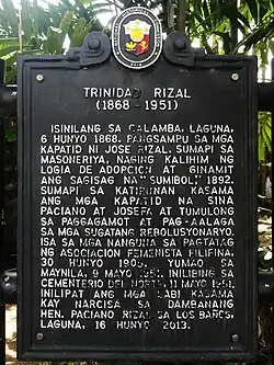 Before his death, José wrote to Trinidad to express his wish that the Rizal family treat his common-law wife, Josephine Bracken, kindly for her devotion to him.[9] Following his execution, Trinidad accompanied Josephine and brother, Paciano, to Cavite where they met revolutionary leader Andrés Bonifacio and passed to him a copy of José's final poem.[10]