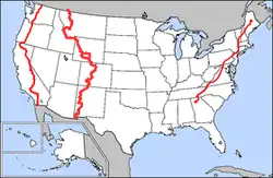 - Continental Divide Trail – 3,028 miles (4,873 km), between Mexico and Canada following the Continental Divide along the Rocky Mountains and traversing Montana, Idaho, Wyoming, Colorado, and New Mexico.[3]