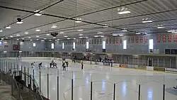 The facility features one NHL size ice pad with seating for approximately 600, and a four sheet curling facility.[3] It also has a two-lane walking and running track, a fitness centre with strength training, spinning classes, aerobic studio, and cardio machines.[3] Also included in the facility are a snack bar, pro shop, program rooms and meeting space. The regional government of York Region operates a two-bay paramedic response station from the centre. An EMS facility was included with the project, providing York Region with a new two-bay paramedic response station.[2]