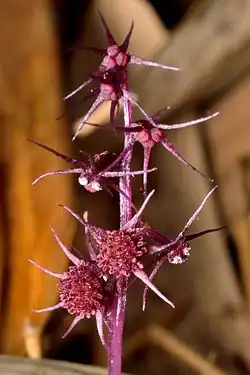 Triuridaceae are a family of tropical and subtropical flowering plants, including nine genera with a total of approximately 55 known species.[2] All members lack chlorophyll and are mycoheterotrophic (obtain food by digesting intracellular fungi, often erroneously called 'saprophytes'). The heterotrophic lifestyle of these plants has resulted in a loss of xylem vessels and stomata, and a reduction of leaves to scales.[3]