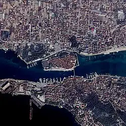 Trogir (Croatian pronunciation: [ˈtrɔ.ɡiːr]) is a historic town and harbour on the Adriatic coast in Split-Dalmatia County, Croatia, with a population of 10,107 (2021)[2] and a total municipal population of 12,393 (2021). The historic part of the city is situated on a small island between the Croatian mainland and the island of Čiovo.[3] It lies 27 kilometres (17 miles) west of the city of Split.