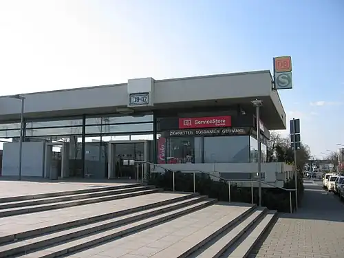 Troisdorf station is a railway junction in the town of Troisdorf in the German state of North Rhine-Westphalia, where the line from Cologne separates into the East Rhine Railway to Neuwied and the Sieg Railway to Siegen. In addition to various regional rail services Troisdorf is served by line S12 of the Rhine-Ruhr S-Bahn. This operates between Troisdorf, Hennef (Sieg) or Au (Sieg) and Köln-Ehrenfeld or Horrem at 20-minute intervals. It is also served by the S19 service between Hennef or Au and Düren, at 20-minute intervals. These two services provide a service every 10 minutes between Troisdorf and Cologne.[5] It is classified by Deutsche Bahn as a category 3 station.[1]