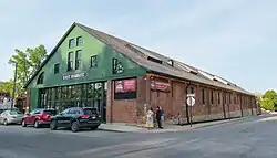 The largest building on the site is a former streetcar paint shop, known as the west car barn.[2] The building contains East Market, a public food hall and marketplace similar to the city's North Market and former East, West, and Central Markets. The building was planned to have six stalls for prepared foods, a produce vendor, and a coffee stall.[3] A 2020 report indicated it will now hold 20 stalls and a restaurant on the main floor, storage and refrigeration in the basement, and an upper floor for marketplace seating and event space. A small speakeasy-themed bar will occupy some ground-floor space, to be open to the public except during private events. A raised patio will be constructed around the building's east end, wrapping around to the north.[2]