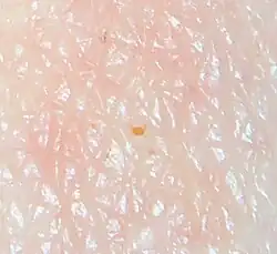 Trombiculidae live in forests and grasslands and are also found in the vegetation of low, damp areas such as woodlands, berry bushes, orchards, along lakes and streams, and even in drier places where vegetation is low, such as lawns, golf courses, and parks.[8] They are most numerous in early summer when grass, weeds, and other vegetation are heaviest. In their larval stage, they attach to various animals, including humans, and feed on skin, often causing itching. These relatives of ticks are nearly microscopic, measuring 400 μm (1/60 of an inch) and have a chrome-orange hue.[9][10] There is a marked constriction in the front part of the body in the nymph and adult stages. The best known species of chigger in North America[11] is the hard-biting Trombicula alfreddugesi of the Southeastern United States, humid Midwest[12] and Mexico. In the UK, the most prevalent harvest mite is Neotrombicula autumnalis, which is distributed through Western Europe to Eastern Asia.[13]