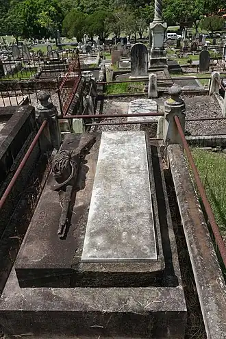 The gravestone is a sarcophagus of Helidon sandstone, 1.9 metres (6 ft 3 in) long and a metre wide.[1]