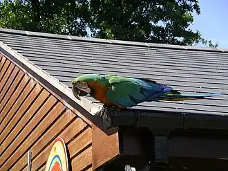 ![]() A free-flying macaw on a roof at Tropical Birdland, Leicestershire. It is a Harlequin Macaw (Greenwing/Blue and Gold hybrid) | |