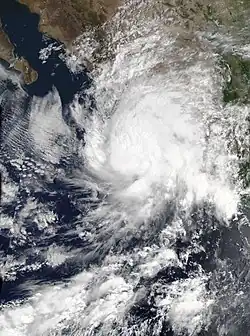 A large tropical storm, Dolores gradually intensified due to favorable environmental conditions for the remainder of the day, characterized by warm sea surface temperatures and low wind shear. The cyclone also underwent a general north-northwestward motion as it rounded the western side of mid-level ridge.[5] Deep convection began to develop in more organized, large rainbands over Dolores' circulation around 09:00 UTC on June 19, and increased in coverage near the storm's center.[6] Dolores continued to become more organized as it neared the coastline of southwest Mexico, with a defined eye and an almost-closed eyewall developing. The storm reached peak intensity shortly before 15:00 UTC that day, with maximum 1-minute sustained winds of 115 km/h (70 mph) and a minimum barometric pressure of 29.2 inHg (989 mbar). Dolores made landfall just after reaching peak intensity near the border of the Mexican states of Colima and Michoacán, slightly northwest of the town of Punta San Telmo in the latter state.[7] Dolores rapidly weakened as it moved inland over western Mexico as it interacted with the mountainous terrain in the area. The cyclone was downgraded to a tropical depression at 03:00 UTC on June 20.[8] Shortly afterward, Dolores' surface circulation dissipated over southwestern Zacatecas.[9] However, mid-level moisture associated with Dolores' remnants continued north over west-central Mexico for another 12–24 hours.[1]