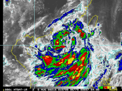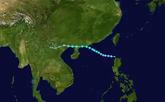 Early the next day the JMA started to issue full advisories on the tropical depression.[5] The Joint Typhoon Warning Center (JTWC) then started to issue warnings on the tropical depression later that day with them designating it as Tropical Depression 10W.[6] Furthermore, later that day both PAGASA and the JTWC upgraded the tropical depression to a tropical storm.[7][8]