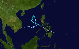 On November 12, PAGASA started to reissue advisories on Quinta, and renamed the system Siony.[18] The JMA were also still monitoring Siony as a minor tropical depression at this time, whilst the JTWC assessed Maysak's remnants chances of regenerating into a significant tropical cyclone as fair.[19][20] Later that day the JTWC upgraded the remnants chances of regenerating as good and released a tropical cyclone formation alert.[21] Later that day PAGASA released their final advisory on tropical depression Siony as it had moved out of their area of responsibility and was moving towards Vietnam in the west.[22] Late the next day the JTWC cancelled the tropical cyclone formation alert as they had reassessed Maysak chances of forming into a significant tropical cyclone within 24 hours as poor.[23] Early the next day the JMA released their final advisory on tropical depression Maysak whilst later that morning the JTWC declared that Maysak had dissipated.