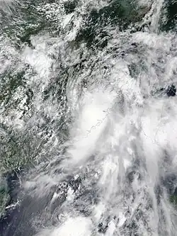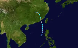 An area of persistent convection formed within the proximity of a through that would spawn Tropical Storm Jangmi on August 7, west of Luzon. As Jangmi became the dominant system in the area, this low-pressure area remained disorganized. However, on the next day, as Jangmi moved away from the area, the system began to organize, and on August 9, the JTWC upgraded the storm to a Tropical Depression.[1] Soon after, at 8:00 p.m. PST, the PAGASA followed and upgraded the storm and gave it the name Ferdie.[2] By the next day, the JTWC upgraded Ferdie into a tropical storm. PAGASA then issued its last warning as Ferdie exited the Philippine Area of Responsibility. Then soon, the JMA followed suit and upgraded Ferdie to a tropical storm, giving it the international name Mekkhala. At 07:30 CST on August 11 (23:30 UTC on August 10), Mekkhala made landfall at Zhangpu County in Fujian, China shortly after peak intensity.[3]