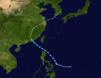At the time of the upgrade, the depression had winds of 30 mph (48 km/h) while 175 miles (282 km) east-southeast of Catanduanes Island in the Philippines.[2][4] Late on September 1, PAGASA upgraded Tropical Depression Mameng (20W) to a tropical storm.[3] Early the next morning, the JTWC relocated the circulation center 200 miles (320 km) to the north as the depression began to approach the island of Luzon.[2][4] Soon after the storm began to move away from Luzon after its closest approach, the JTWC upgraded Tropical Depression 20W to a tropical storm and assigned it the name Wendy.[2][4] At 0000 UTC on September 3, the JTWC, PAGASA, and the JMA, the official warning center for the region reported that Wendy (Mameng) had reached its peak intensity with PAGASA issuing its final advisory as it moved out of its area of responsibility. The JTWC reported that peak intensity was 45 mph (72 km/h) (1-min winds), PAGASA reported that peak intensity was 50 mph (80 km/h) (10-min winds), and the JMA reported that peak intensity was 40 mph (65 km.h) (10-min winds).[3][4][5] Twelve hours later, the JMA downgraded the tropical storm to a depression.[5] Tropical Storm Wendy continued to move towards the Chinese coast for the next day.[2][4] As it was nearing land, a Central Dense Overcast, an area of very strong thunderstorms, formed and the tropical storm made landfall about 140 miles (230 km) east-northeast of Hong Kong,[2] and promptly weakened into a tropical depression.[4] The tropical depression dissipated early on September 4 while over the mountains of China.[4][5]