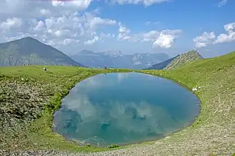 Tropojë Lake (Albanian: Liqeni i Tropojës) is a small mountain lake in the Accursed Mountains in western Kosovo, only 180m from the Albanian border. [1] The lake has an oval shape and is 100 m (330 ft) in length and 40 m (130 ft) in width. Rivers that originate on this lake flow downwards to join larger rivers and then finally flow into the White Drin.