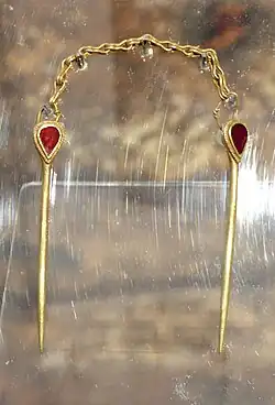 The occupant of the grave was a woman, aged about 16, who had moved from a region in southern Germany near the Alps shortly before her death.[1] She was buried lying on a wooden bed (now decayed, but identifiable from its iron brackets). She was buried with a number of grave goods, including an iron knife, a chatelaine, and some glass beads that perhaps originally decorated a purse. An ornate gold pectoral cross was found on her breast. The cross, only 3.5 cm across, is inlaid with garnets, and would have been sewn onto the robe that she was wearing, as indicated by loops on the back of each arm of the cross.[2][3][4]
