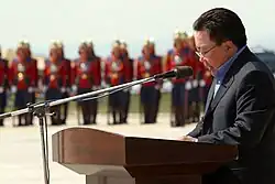 Then he worked as a consultant at the Millennium Development Goal Project, United Nations Headquarters in New York City and as a consultant at Radio Free Asia in Washington, D.C. in 2002–2003.[76] Afterwards, he returned to Mongolia and made series of public speeches touring in Mongolian provinces inspiring the people and the youth sharing his new ideas and perspectives based on his knowledge from Harvard University and the United States in combination with Mongolian way of life in 2003–2004.[77] His lectures played a significant role to make Democratic Party get majority seats in 2004 Mongolian Parliamentary elections.[78]