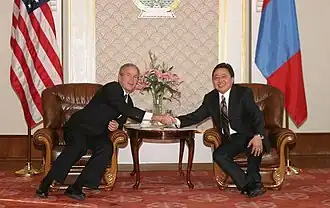 U.S. President George W. Bush meets Mongolian Prime Minister Elbegdorj in Ulaanbaatar on 21 November 2005