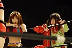 On December 31, Fujimoto entered the Super Ice-Cup tournament, defeating Mai Ichii in her first round match.[24] On January 4, 2010, Fujimoto first defeated Hikaru Shida in the semifinals and then Emi Sakura in the finals to not only win the Super Ice-Cup, but to also become the new ICE×60 Champion.[25] After successful defenses against Hamuko Hoshi, Makoto and Hikari Minami, Fujimoto lost the title to Miyako Matsumoto on March 21.[26][27][28][29] For most of 2010, Fujimoto was involved with NEO Japan Ladies Pro Wrestling performer Natsuki☆Taiyo, first as her partner and then opposite her, unsuccessfully challenging her for the NEO High Speed Championship on May 3.[30] On October 20, Fujimoto and Shida received their first shot at the International Ribbon Tag Team Championship, but were defeated by Emi Sakura and Nanae Takahashi.[31] On December 11, Fujimoto became a champion again, when she defeated Kazumi Shimouma and Hamuko Hoshi for the Triangle Ribbon Championship.[32] Just two weeks later on December 23, Fujimoto and Shida defeated Sakura and Takahashi in a rematch to become the new International Ribbon Tag Team Champions.[33] Fujimoto's December was capped off three days later, when she defeated Command Bolshoi to regain the ICE×60 Championship, meaning that she now held all three Ice Ribbon championships simultaneously.[34] Fujimoto and Shida went on to successfully defend the International Tag Team Championship against Hikari Minami and Riho on January 4, 2011, and against the teams of Mochi Miyagi and Ryo Mizunami, and Makoto and Riho on February 6, winning the "Ike! Ike! Ima, Ike! Ribbon Tag Tournament" in the process.[35][36] In early 2011, Fujimoto began feuding with Ice Ribbon newcomer Ray, starting on February 26, when Ray pinned Fujimoto in a tag team match, only her second match in the promotion.[37] On March 2, Ray challenged Fujimoto for the Triangle Ribbon Championship in a three-way match, which also included Chii Tomiya. The match ended with both Fujimoto and Ray simultaneously pinning Tomiya, which resulted in Fujimoto being stripped of the title.[38] She would regain the title three days later by defeating Hikaru Shida and Makoto.[39] On March 19, Ray and Emi Sakura defeated Fujimoto and Shida in a non-title match and afterwards laid a challenge for the International Ribbon Tag Team Championship.[40] On March 21, Fujimoto successfully defended the ICE×60 Championship against Ray.[41] However, five days later, Ray and Sakura defeated Fujimoto and Shida for the International Ribbon Tag Team Championship, ending Muscle Venus' reign at 93 days and breaking Fujimoto's Triple Crown.[42] On June 29, Fujimoto lost the Triangle Ribbon Championship to Neko Nitta in a match that also included Ray.[43]