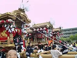 Danjiri are large wooden carts (danjiri guruma) in the shape of a shrine or temple. The carts, often being crafted out of wood, are very ornate, with elaborate carvings. Towns with danjiri festivals in them have different neighborhoods, each with their own guild responsible for maintaining their own danjiri cart. The cart is kept in storage for most of the year. As the festival approaches, the danjiri cart is prepared with elaborate flower arrangements, prayer cards, ornaments, and religious consecrations. They also make a special song every year. It is believed that spirits or gods reside in the danjiri. The person on the roof of the Danjiri cart controls the direction of movement and performs a traditional fan dance.[3]