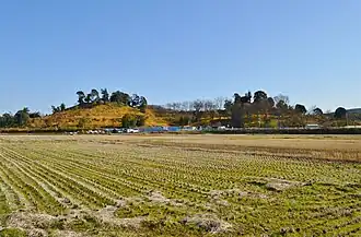 The Tsukuriyama Kofun is a zenpō-kōen-fun (前方後円墳), which is shaped like a keyhole, having one square end and one circular end, when viewed from above. The tumulus was built by cutting a hill on the right bank of the Ashimori River in the western part of Okayama city. The tumulus consists of three tiers, and each tier was lined with cylindrical haniwa and covered with fukiishi. It has a length of approximately 350 meters, and is estimated to have been built in the first half of the 5th century. A characteristic of this burial mound is that the ratio of the posterior circular portion to the length of the mound is large. The anterior portion is thought to have been modified in the Sengoku period, when a Shinto shrine was constructed, and a hamlet exists on the southeastern end of the mound. The chozubachi placed next the shrine is the body part of a hollowed-out sarcophagus made of tuff, and fragments of the lid of the sarcophagus are scattered on the right side of the shrine. This sarcophagus is presumed to have been robbed from one of the tumuli in this area at some unknown date. From the size of the tumulus, it is believed to be the tomb of the 5th century kings of the Kingdom of Kibi. The posterior portion was also flattened and was used as a fortification and lookout point during Toyotomi Hideyoshi's invasion of western Japan.[2]