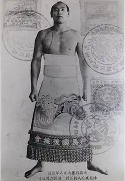 ![]() Tsushimanada in a 1919 postcard commemorating his promotion to Ōzeki | |