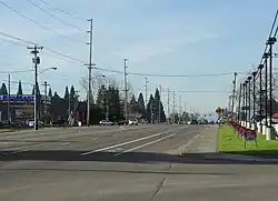 About 1918, a highway constructed of concrete was built between Beaverton and Hillsboro.[4] The highway replaced a dirt road maintained by the county that ran on the southern side of the railroad tracks.[4] This earlier road came from Portland along Farmington Road and veered north on what is now Kinnaman Road in Aloha until 209th Avenue in Reedville where it ran parallel to the rail tracks.[4] Farther west at Witch Hazel the early road then followed the modern Witch Hazel and River Roads into Hillsboro proper.[4] Hillsboro decided in March 1919 to have the new road travel along Baseline Street, two blocks south of Main Street where the road was to run.[5]