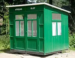 Tuberculosis huts existed in various forms, but in general they were simple premanufactured wooden buildings, that could be put together on the spot.[3] They were white or green, with a lot of glass to allow the entering of as much sunlight as possible. On the front side, the houses were either fully open, or they contained large doors that could be opened wide.[4][2][1] The huts in Colorado Springs were fixed to one place. The type of huts that was used in British hospitals, could be rotated on turntables towards the sun and out of the wind, to optimise the recovery conditions for the patients.[1] In the Netherlands, both the fixed and the revolving types could be found.[2][5][4]