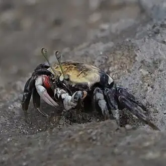 - ^ Shih, Hsi-Te; Ng, Peter K. L.; Davie, Peter J. F.; Schubart, Christoph D.; et al. (2016). "Systematics of the family Ocypodidae Rafinesque, 1815 (Crustacea: Brachyura), based on phylogenetic relationships, with a reorganization of subfamily rankings and a review of the taxonomic status of Uca Leach, 1814, sensu lato and its subgenera". The Raffles Bulletin of Zoology. 64.