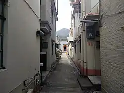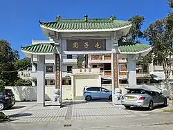The wall of Tuen Tsz Wai was rebuilt in 1978. The entrance gate of the walled village, originally at the southern end of the central axis, was demolished and a new one was built further east, at the location of a former watchtower. A new permanently closed gate was rebuilt on the site of the former entrance gate as a memorial. The move and reconstruction of the entrance gate are the consequence of the establishment of the Miu Fat Monastery: having a monastery face directly the entrance of a village is considered to have a negative influence on its feng shui.[3][7] The former name of the village, "Tin Tsz Wai" (田子圍) is still inscribed on the former gate. A shrine is located at the northern end of the central axis. It was rebuilt in 1983.[7]