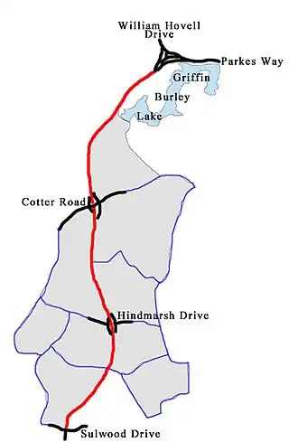 | Tuggeranong | Kambah | 11.3 | 7.0 | Drakeford Drive – Tuggeranong / Sulwood Drive – Wanniassa | Signal controlled crossroads; Parkway terminus: roadway continues south as Drakeford Drive |