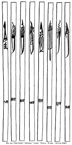 The physical cards are very long and narrow, typically measuring about 8 inches (200 mm) tall and 0.25 inches (6.4 mm) across.[2] They are made of oiled paper or leather.[1][2] The backs are usually decorated with a stylized feather design.[4]
