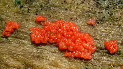 Tulasnella aurantiaca was first published in 1851 by German mycologist Hermann Friedrich Bonorden who placed it in a new genus, Hormomyces. Microscopically, the species produces branched chains of hyaline, globose conidia and no teleomorphic (basidia-bearing) state is known. As a result, its disposition and relationships have long been uncertain. French mycologist Narcisse Théophile Patouillard suggested that Hormomyces aurantiacus was an anamorph of a Dacrymyces species.[1] Italian mycologist Pier Andrea Saccardo later suggested that H. aurantiacus might be the anamorph of Tremella mesenterica,[2] a view accepted by influential Dutch mycologist M.A. Donk.[3] Molecular research, based on cladistic analysis of DNA sequences, has, however, shown that the species is an anamorphic member of the genus Tulasnella.[4]