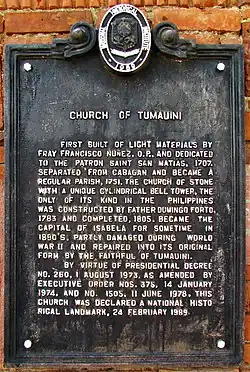 Tumauini Church was declared a National Cultural Treasure by the National Museum of the Philippines. The National Historical Commission of the Philippines declared Tumauini Church a National Historic Landmark on February 24, 1989.[2]