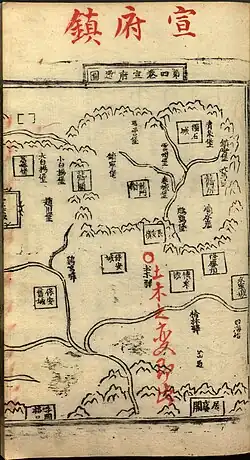 Map of the Xuanfu Garrison in the Huang Ming jiu bian kao (皇明九邊考), 1544. Location of the battle of Tumu on the map: