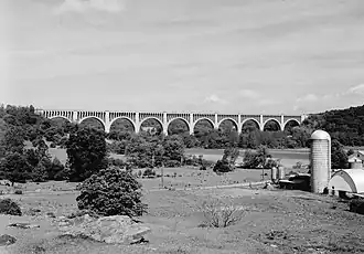 The 2,400-foot-long (730 m) Erie Lackawanna Railway Tunkhannock Viaduct (called locally the "Nicholson Bridge"), featuring multiple high concrete arches, passes over the creek near Nicholson.