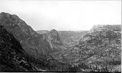 Below the O'Shaughnessy Dam the Tuolumne passes Poopenaut Valley and enters a series of continuous canyons as it flows through the Sierra foothills, leaving the western boundary of Yosemite National Park and entering the Stanislaus National Forest. Most of the Tuolumne's main tributaries join within this reach, beginning with Cherry Creek from the north just below the intake of the Hetch Hetchy Aqueduct, which delivers water to San Francisco. The South Fork of the Tuolumne joins from the south a few miles downstream, near Groveland-Big Oak Flat, followed by the Clavey River from the north a few miles after that.[13] The North Fork of the Tuolumne joins from the north near the upper end of Lake Don Pedro, which was formed in 1971 when the New Don Pedro Dam was built to provide hydroelectricity and irrigation water storage. Directly below Don Pedro Dam is the La Grange Dam, where about half the river's natural flow is diverted into the Turlock and Modesto Main Canals to irrigate over 200,000 acres (81,000 ha) in the Central Valley.[14][15]