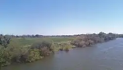 Leaving the foothills, the Tuolumne flows approximately 50 miles (80 km) west across the Central Valley to its confluence with the San Joaquin River, passing Waterford, Hughson, Empire, Ceres and Modesto. The lower Tuolumne is wide and slow-flowing, dropping just 230 feet (70 m) from the base of La Grange Dam to its mouth at 26 feet (7.9 m).[16] Highway 99 and the Southern Pacific Railroad tracks both cross the river in Modesto, and the Modesto Airport is located adjacent to the river shortly upstream. Dry Creek joins the Tuolumne from the north between the airport and the railroad. The confluence of the Tuolumne and San Joaquin is located in the San Joaquin River National Wildlife Refuge, about 2 miles (3.2 km) north of Grayson in Stanislaus County.[17]