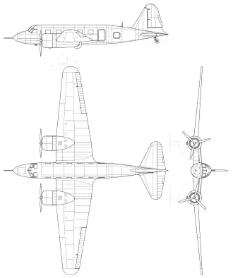 The ANT-35's cabin, with a headroom of only 1.68 m (5 ft 6 in), and further constricted by having the wing spars pass through it, was very cramped, and the second prototype, designated the ANT-35bis, had the fuselage height increased by 0.15 m (5.9 in), greatly improving space for the passengers, while two 750 kW (1,000 hp) Wright Cyclone G2 engines were fitted.[3][6] The ANT-35bis was completed in June 1937, and the type was put into production at Factory No 22 in Moscow, with production aircraft powered by Cyclones or the Soviet licence-built derivative, the Shvetsov M-62IR, with deliveries starting in 1938. By 1939, Soviet factories had begun license-building the Douglas DC-3 airliner, which used the same engines but could carry twice the passengers over a greater range and production of the ANT-35bis was stopped in 1939, with only nine aircraft (plus the two prototypes), completed.[7][4]