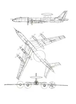 The first prototype Tu-126 flew on 23 January 1962.[2] Testing, which continued through the autumn of 1964, showed that while the radar was effective over water, performance was poorer over land.[2] It was also found that the large contra-rotating propellers of the four engines seriously compromised the performance of the radar. This problem was only marginally countered by the installation of a new radar called Shmel.[3]