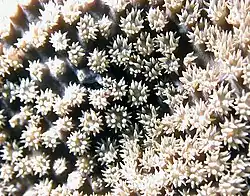 Turbinaria stellulata tends to be submassive with encrusting margins and does not produce vertical structures to any extent. The corallites are about 2 mm (0.08 in) in diameter and have thick walls. This coral is a zooxanthellate coral that houses symbiont dinoflagellates in its tissues. It is usually some shade of brown or green, but other colours sometimes occur, depending on which species of symbiont is present.[2][3] Colonies are dome-shaped and grow to a diameter of about 50 cm (20 in).[1]
