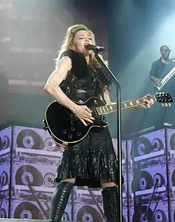 Madonna performed "Turn Up the Radio" on the MDNA Tour as the third song of the second segment of the concert, titled Prophecy, where a mix of joyful songs that "bring people together" were performed.[66][67] The wardrobe during the performance included an all-leather look, a custom design by Hervé Léger and Max Azria, with knee-high boots and a mini fur bolero.[68] After "Give Me All Your Luvin'", she left the stage early for a costume change. A video interlude called "Turning Up the Hits" started, where excerpts of "Holiday", "Into the Groove", "Lucky Star", "Like a Virgin", "4 Minutes", "Ray of Light" and "Music" were played.[69] Madonna appeared on the stage with a guitar and started singing the song. She was accompanied by two guitarists on the steps, which moved up-and-down. In the middle of the track, she invited the audience to sing-along with her.[70]