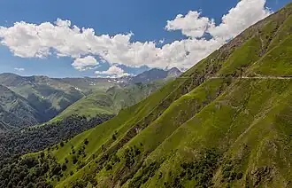 The park is set in the Tusheti Mountainous region in the north-eastern part of the country. It is 205 kilometres (127 mi) away from Tbilisi with the en route Alvani lying 120 kilometres (75 mi) away. Omalo-Alvani highway of 85 kilometres (53 mi) length is in a hilly terrain and is difficult to drive. The visitor center to the parks and reserves of Tusheti is located along the 85 kilometres (53 mi) of the main watershed ridge of Caucasus in lower Omalo.[7] Its ecoregion is that of the Caucasus mixed forests.[8]
