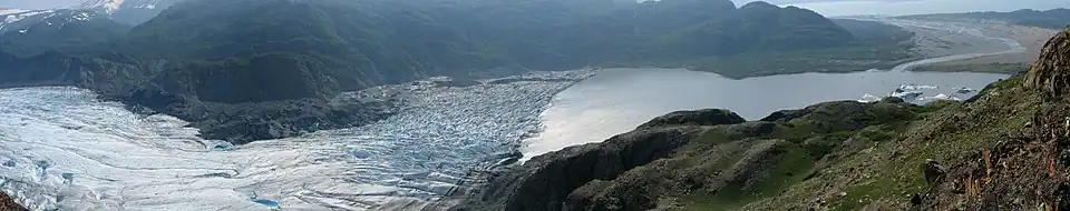The Tustumena Glacier is a glacier located on the Kenai Peninsula of Alaska. The Tustumena Glacier begins in the Harding Icefield and makes its way down west for about 20 miles (32 km) until its terminus roughly 5 miles (8.0 km) before Tustumena Lake. The glacier is retreating[1] due to global warming.