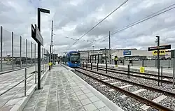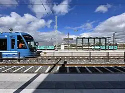 Construction on a branch line to Kista and Helenelund started in February 2018.[16] The new branch was scheduled to open its first part to Bromma Airport in December 2020,[17] however this was postponed, as approval from Swedavia was needed in order for the trams to be able to run past the airport.[18] In cold weather, sparks arise from the trams' overhead contact line, which could disrupt radio signals in the air traffic control tower at Bromma Airport. Tests needed to be carried out in sub-zero temperatures to gain approval for traffic.[19]